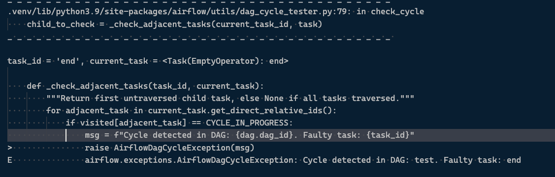 더 자세히def test_task_dependencies(): ## DAG, 테스크 무결성 테스트 dag_bag = DagBag(dag_folder='dags',include_examples=False) dag = dag_bag.get_dag('test') tasks = dag.tasks dependencies = { 'start': {'downstream': ['print_messages'], 'upstream': []}, 'print_messages': {'downstream': ['end'], 'upstream': ['start']}, 'end' : {'downstream': [], 'upstream': ['print_messages']}, } for task in tasks: assert task.downstream_task_ids == set(dependencies[task.task_id]['downstream']) assert task.upstream_task_ids == set(dependencies[task.task_id]['upstream'])위와같은 형식으로 지정시 더 자세한 의존성에 대해 검증이 가능하다.