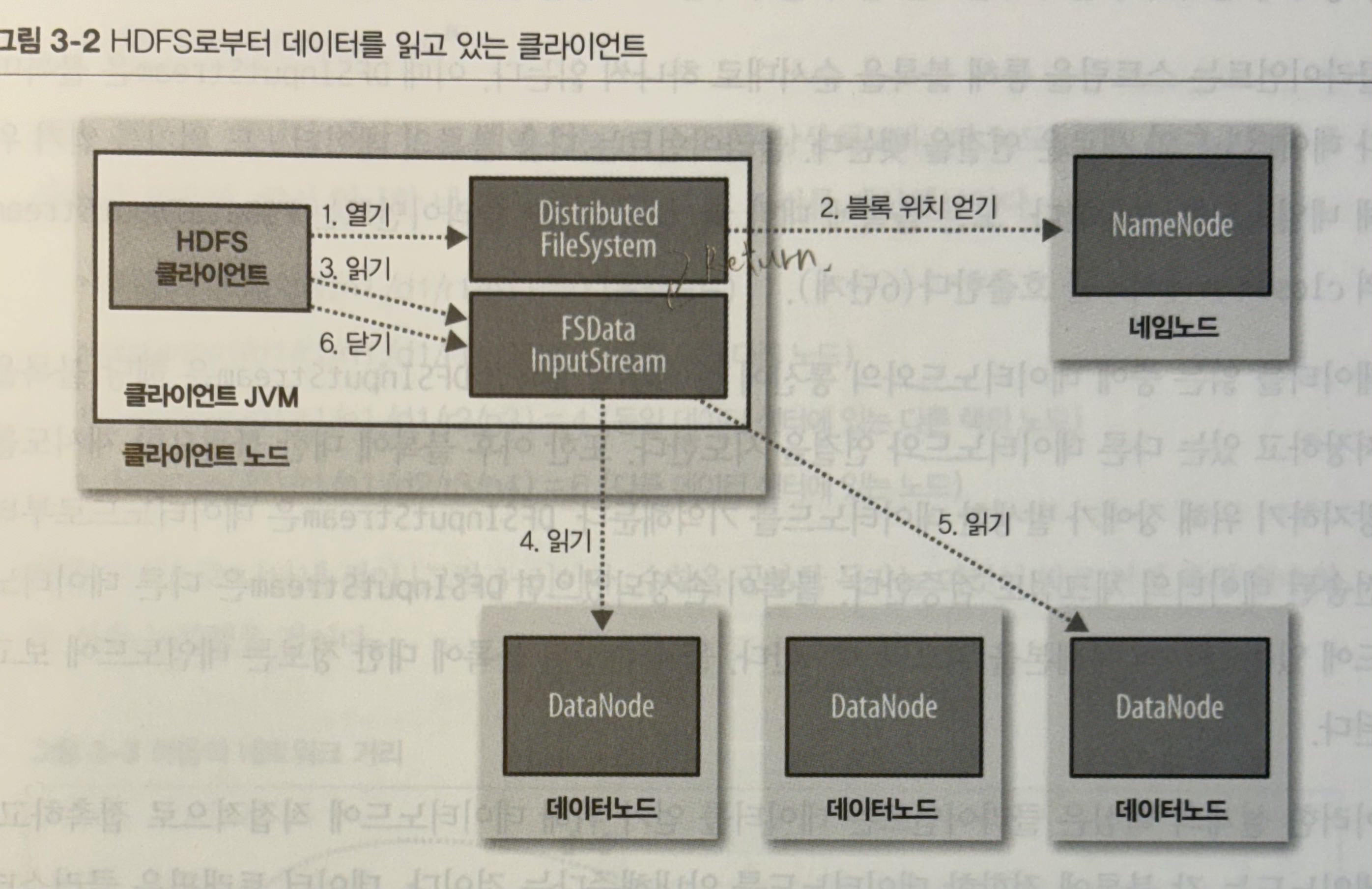 - HDFS JVM Client를 통해서 읽고자하는 파일을 여는 명령을 날린다. (Client node 영역)